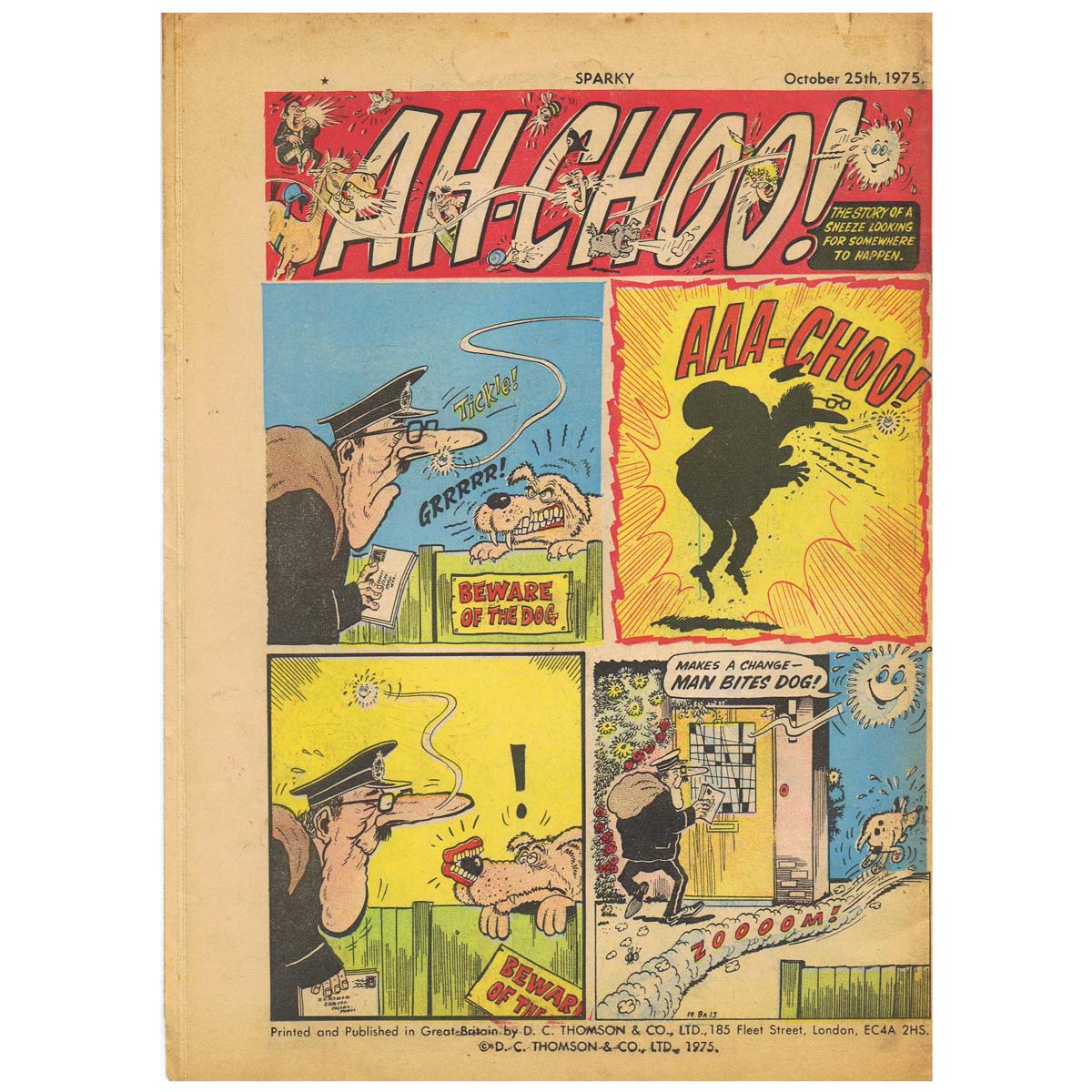 Sparky (1965 to 1977, dΓ©but issue 23 Jan, 1965) was a D.C. Thomson entry that fell between the two stools of Bimbo and Beano.